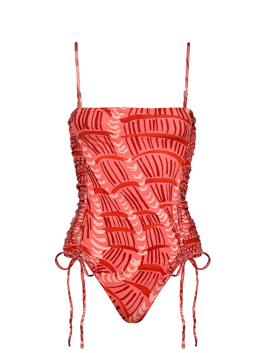 Regular price $165.00 Sale price $82.50 -50%The Manuela Pink Sabbia One-Piece swimsuit showcases adjustable spaghetti straps and side ties, offering customizable torso length and a flattering silhouette. Adorned with a bold graphic pink print, this piece exudes feminine charm and versatility, finished with removable cups for added comfort and support.