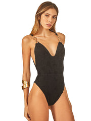 Regular price $205.00 Sale price $153.75 - 25%The Lily Swimsuit is a versatile one-piece that can be worn as a swimsuit or as a bodysuit. The bathing suit is made from high quality textured fabric and is lined. The gold-plated chain on the strap doesn't oxidize. This one piece has no padding and comes with adjustable straps.