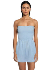 Regular price $98.00 - Liquid error (snippets/product-template line 134): Computation results in '-Infinity'%The Torey Romper presents a playful yet effortless design in blue pastel, featuring a strapless smocked bodice with scalloped trim and flowy gathered shorts for a flattering, feminine silhouette ideal for warm-weather days.