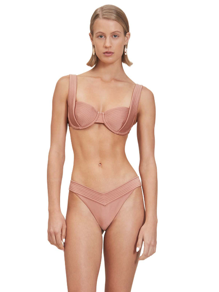 The Rue is an underwire top with topstitching detail at cups, and a metal buckle at back for a secure closure. Pairs back with the Renee Bottom. The Renee is a cheeky bottom with a topstitching detail along the top-edge. Model wearing a size Small. Height 5’11”, Bust 32B, Waist 24”, Hips 35". Hand Wash in Cold Water. Do Not Bleach. Do Not Tumble Dry. Do Not Dry Clean. Do Not Iron. Dry in Shade.