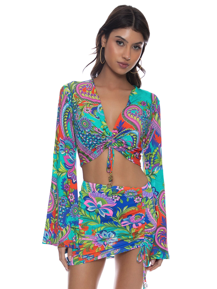 A bold and vibrant ensemble featuring a bell-sleeve scrunched crop top and a coordinating scrunched mini skirt in a striking paisley print. The top boasts dramatic sleeves and a ruched front detail, while the skirt is designed with adjustable ruching for a flattering fit. A perfect statement look for beachside glamour or resort wear.