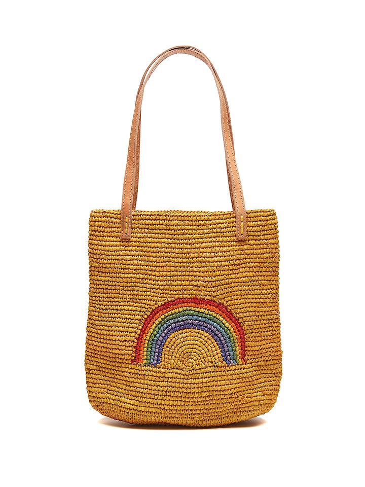 Regular price $110.00 - Liquid error (snippets/product-template line 192): Computation results in '-Infinity'%This new Petite Rainbow tote features crocheted rainbows in cheery colors. It has leather carry handles and a cute silhouette. Perfect for the littles for the beach and beyond. Measurement: 12" x 11” x 4"; 9."