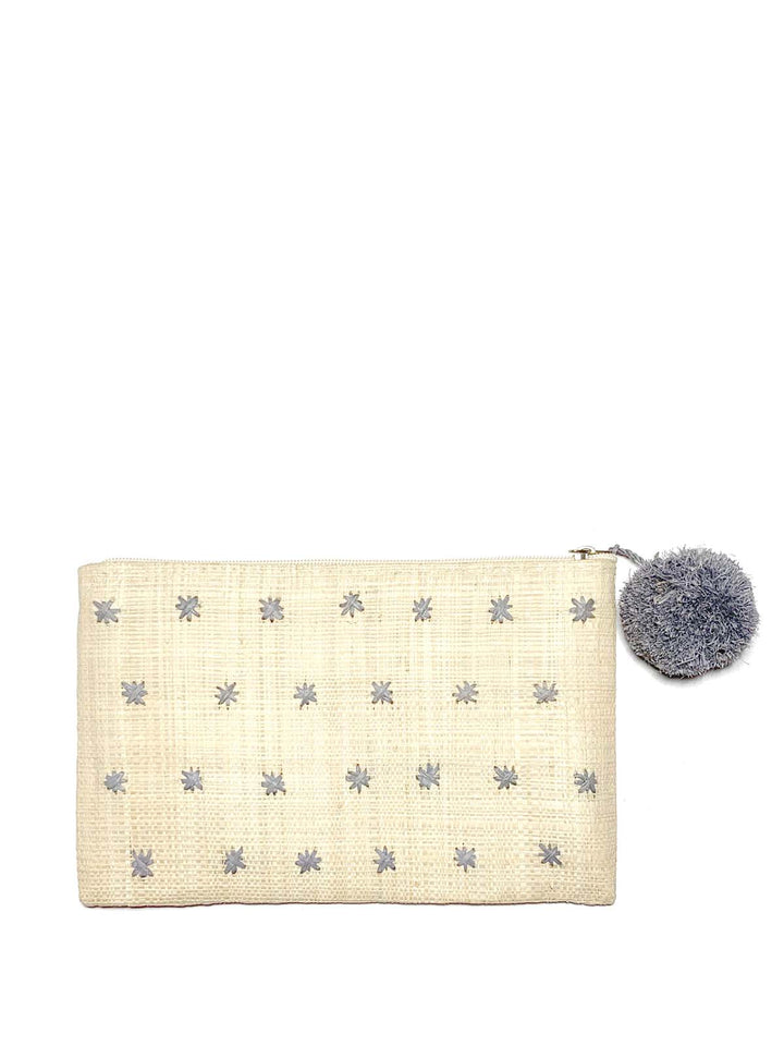 Great for gifts, the Sofia pouches are a must have for anyone who loves handbags or likes to stay organized. It can be worn as a clutch or filled with essentials and tossed in a roomy tote. It features zip closure and raffia poms. 9.5"W x 6"H - Approximate dimensions, each piece is handmade.