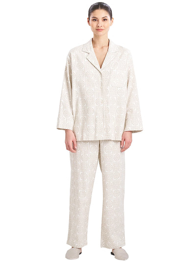 Regular price $180.00 - Liquid error (snippets/product-template line 192): Computation results in '-Infinity'%This relaxed pajama set in a soft neutral tone showcases an all-over geometric pattern, featuring a notch-collar top and matching wide-leg pants. The lightweight flannel fabric adds an element of warmth and sophistication for luxurious lounging.