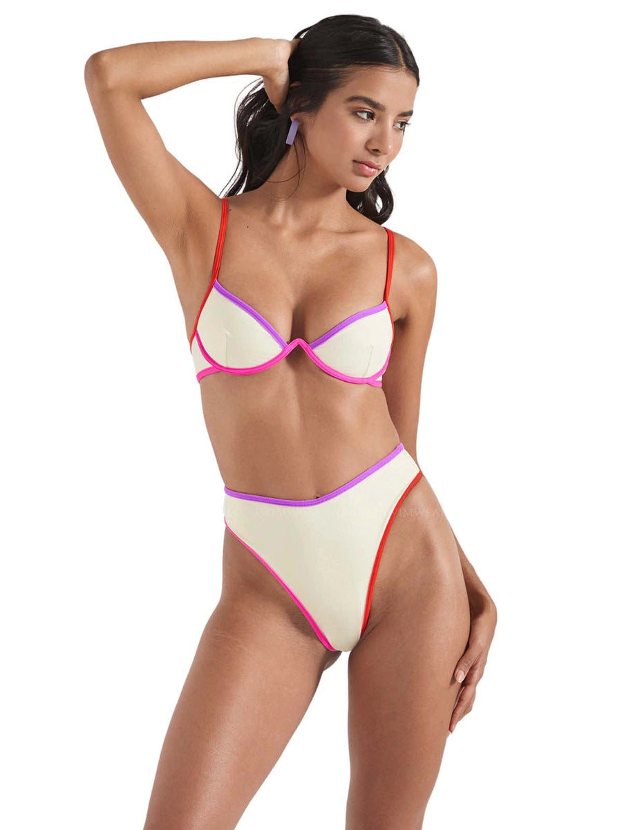Regular price $65.00Elegant balconette, designed without pads for a natural and sleek silhouette. It features adjustable straps for a customized fit and is accented with a subtle color lining detail that adds a touch of sophistication. Perfect for those who appreciate understated style with a hint of modern flair. Explore high-waisted bottom, crafted for a flattering fit with a high-leg cut that elongates the legs. Available in both cheeky and full coverage options to suit your style preference, it features a distinctive color lining for an added pop of style. This bottom is perfect for those who seek both comfort and chic, modern flair in their swimwear.