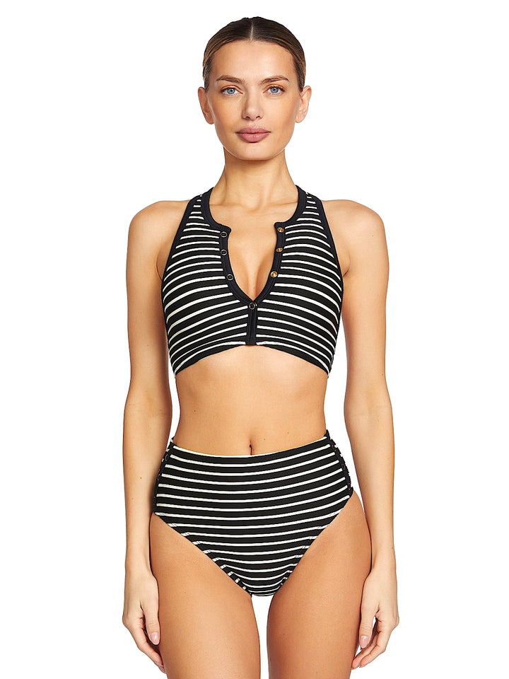 Regular price $118.00 - Liquid error (snippets/product-template line 204): Computation results in '-Infinity'%This stylish bikini features a tank-style top with a racerback design and a deep scoop neckline, accented by gold-tone buttons for a chic touch. The high-waisted bottom enhances the silhouette with a flattering fit, while the bold black-and-white striped pattern exudes timeless sophistication. Designed for both style and comfort, this set is perfect for making a refined statement at the beach or poolside.