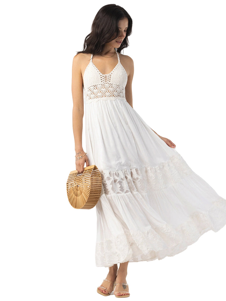 Regular price $188.00 - Liquid error (snippets/product-template line 204): Computation results in '-Infinity'%Every moment is a special occasion when you complete your style with the Isabella Maxi Dress. Medium-weight rayon fabric with lace detail meets hand-crochet in this sultry halter bodice, trimmed with adjustable ties and framed by flowing lace details for a head turning touch and unmatched elegance. The dress features hand crochet top, plunging v-neck, adjustable halter ties, low back, elastic waist, and tiered lace panel skirt. Hand wash cold & Lay flat to dry. Model is 5'9.