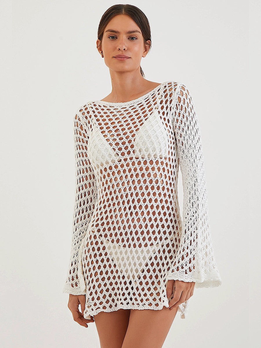 This short cover-up dress features an open-knit crochet look with a sheer finish, offering a playful yet sophisticated take on beach layering. The relaxed silhouette and long sleeves add balance to the breezy design, making it an effortless piece to slip on over your favorite swimwear.